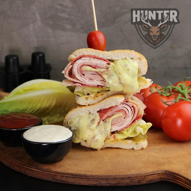 ۱۲۰ گرم ژامبون گوشت و مرغ ۷۰%، چیپس، سس مخصوص، قارچ، پنیر پیتزا، گوجه، خیارشور، کاهو، نان باگت