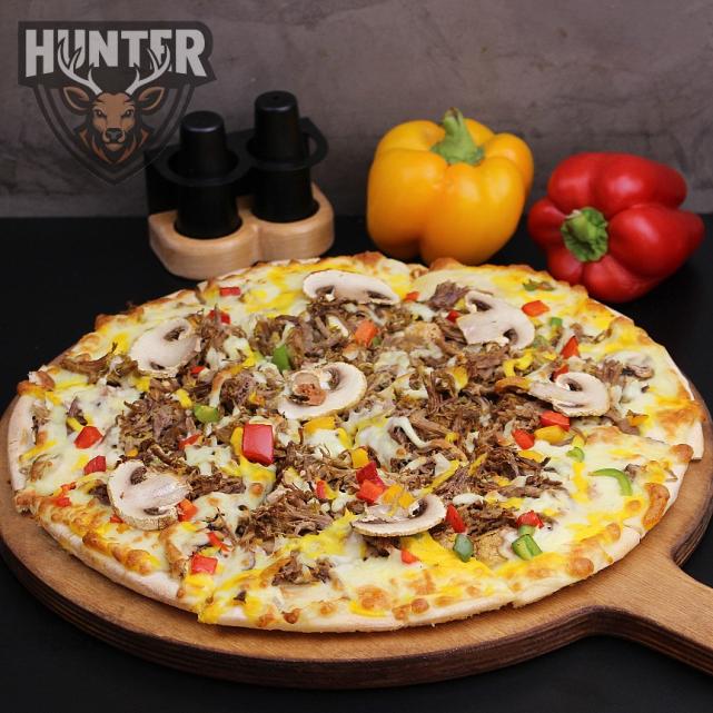 خمیر پیتزا ایتالیایی، گوشت راسته گوساله، قارچ، فلفل دلمه ای، پنیر موزارلاخمیر پیتزا ایتالیایی، گوشت راسته گوساله، قارچ، فلفل دلمه ای، پنیر موزارلا