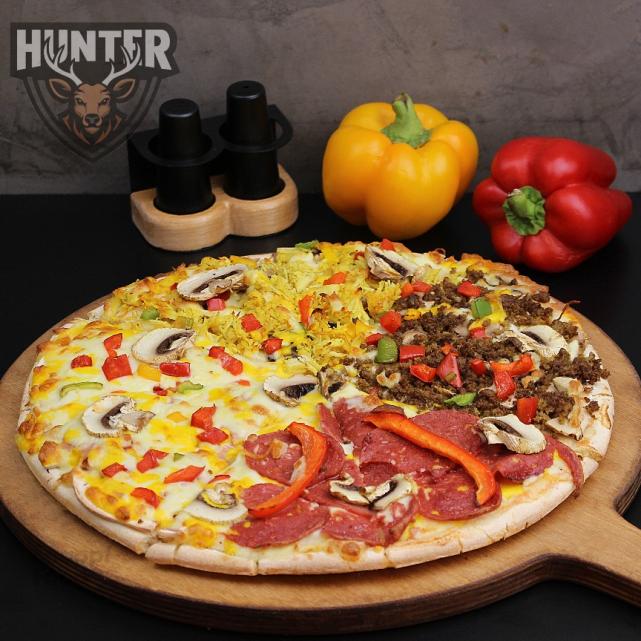 خمیر پیتزا ایتالیایی، ۲ اسلایس مخصوص، ۲ اسلایس مرغ و قارچ، ۲ اسلایس گوشت و قارچ، ۲ اسلایس پپرونی، قارچ، فلفل دلمه، پنیر موزارلا